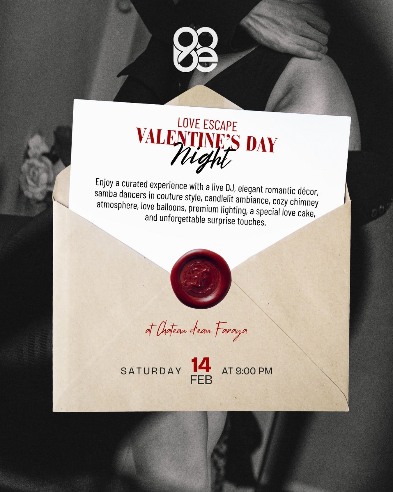 Enjoy a curated experience with a live DJ, elegant romantic décor, samba dancers in couture style, candlelit ambiance, cozy chimney atmosphere, love balloons, premium lighting, a special love cake, and unforgettable surprise touches.